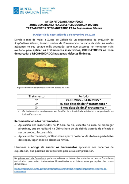 AVISO FITOSANITARIO 1/2025 ZONA DEMARCADA FLAVESCENCIA DOURADA DA VIDE TRATAMENTOS FITOSANITARIOS PARA Scaphoideus titanus. Tratamentos insecticidas, OBRIGATORIOS na zona demarcada e RECOMENDADOS nas zonas vitícolas lindeiras. No noso concello, o tratamento é OBRIGATORIO na parroquia de Santa María e RECOMENDADO no resto do concello.