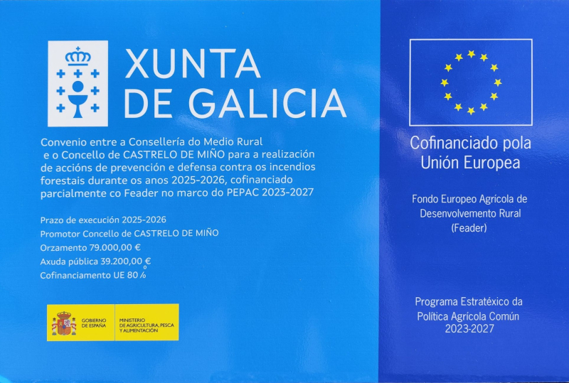 Con data de hoxe, 1 de xullo de 2025, inícianse os traballos de roza mecanizada conforme ao CONVENIO ENTRE A CONSELLERÍA DO MEDIO RURAL E A ENTIDADE LOCAL, CONCELLO DE CASTRELO DE MIÑO, PARA A REALIZACIÓN DE ACCIÓNS DE PREVENCIÓN E DEFENSA CONTRA OS INCENDIOS FORESTAIS DURANTE OS ANOS 2025-2026, COFINANCIADO PARCIALMENTE CO FONDO EUROPEO AGRÍCOLA DE DESENVOLVEMENTO RURAL (FEADER) NO MARCO DO PLAN ESTRATÉXICO DA POLÍTICA AGRARIA COMÚN (PEPAC) 2023-2027.